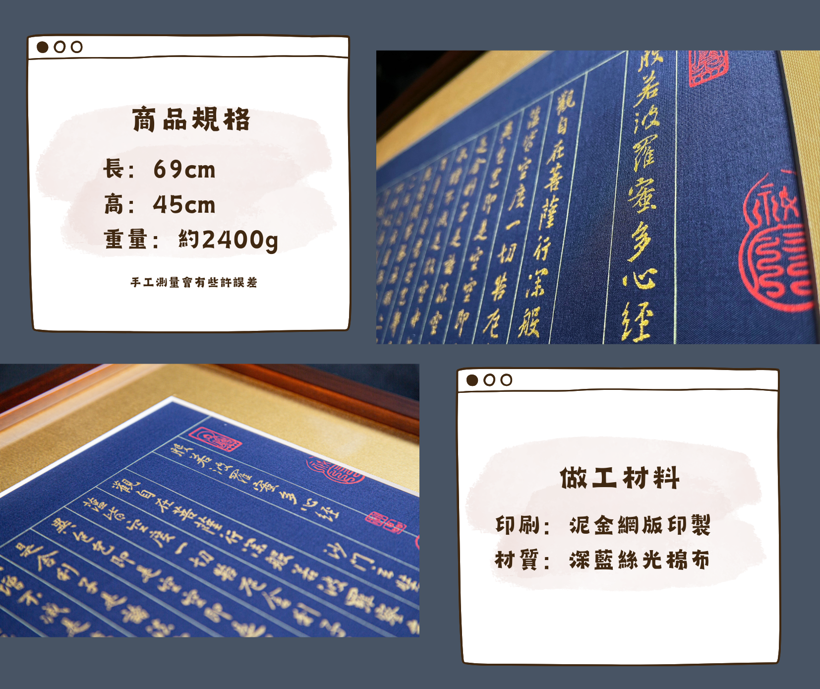 本幅《心經》出自唐代懷仁法師歷時二十四年集摹王羲之書跡之作,採用泥金網版印刷技術,金色文字細膩展現於深藍絲光棉布上。
